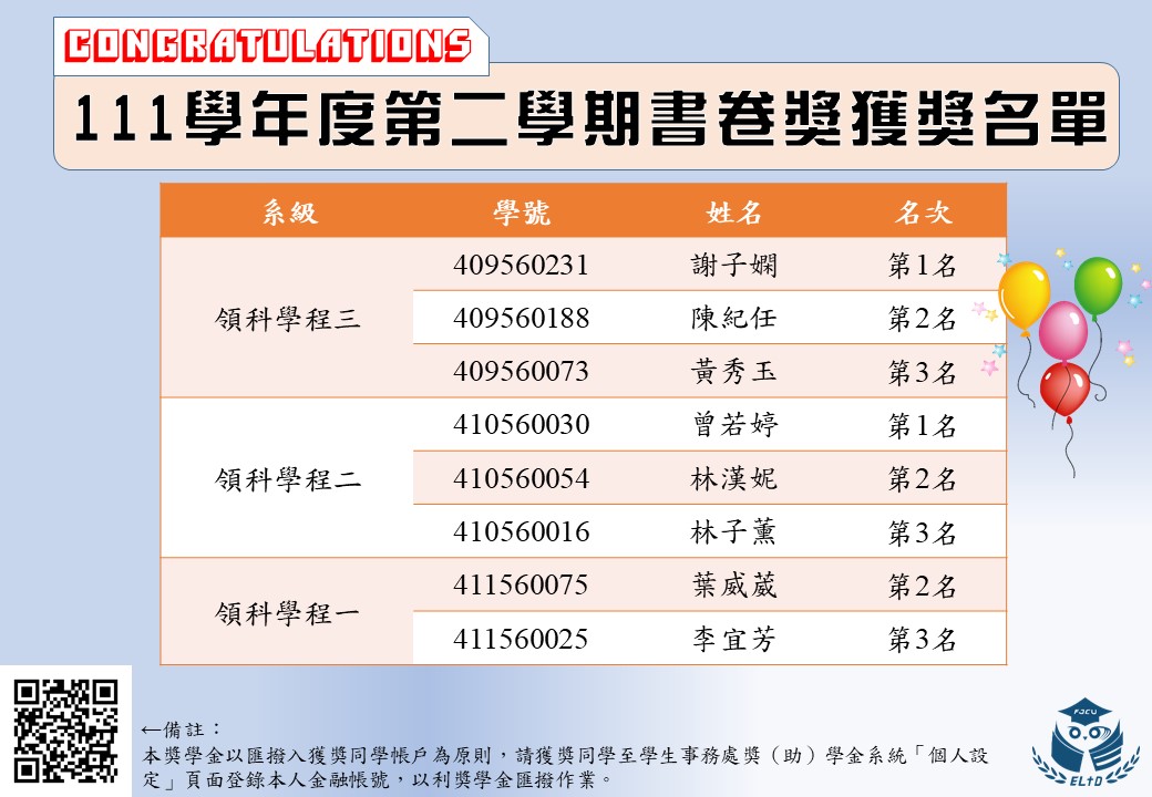 【111學年度第二學期書卷獎獲獎名單公告,恭喜獲獎同學!!