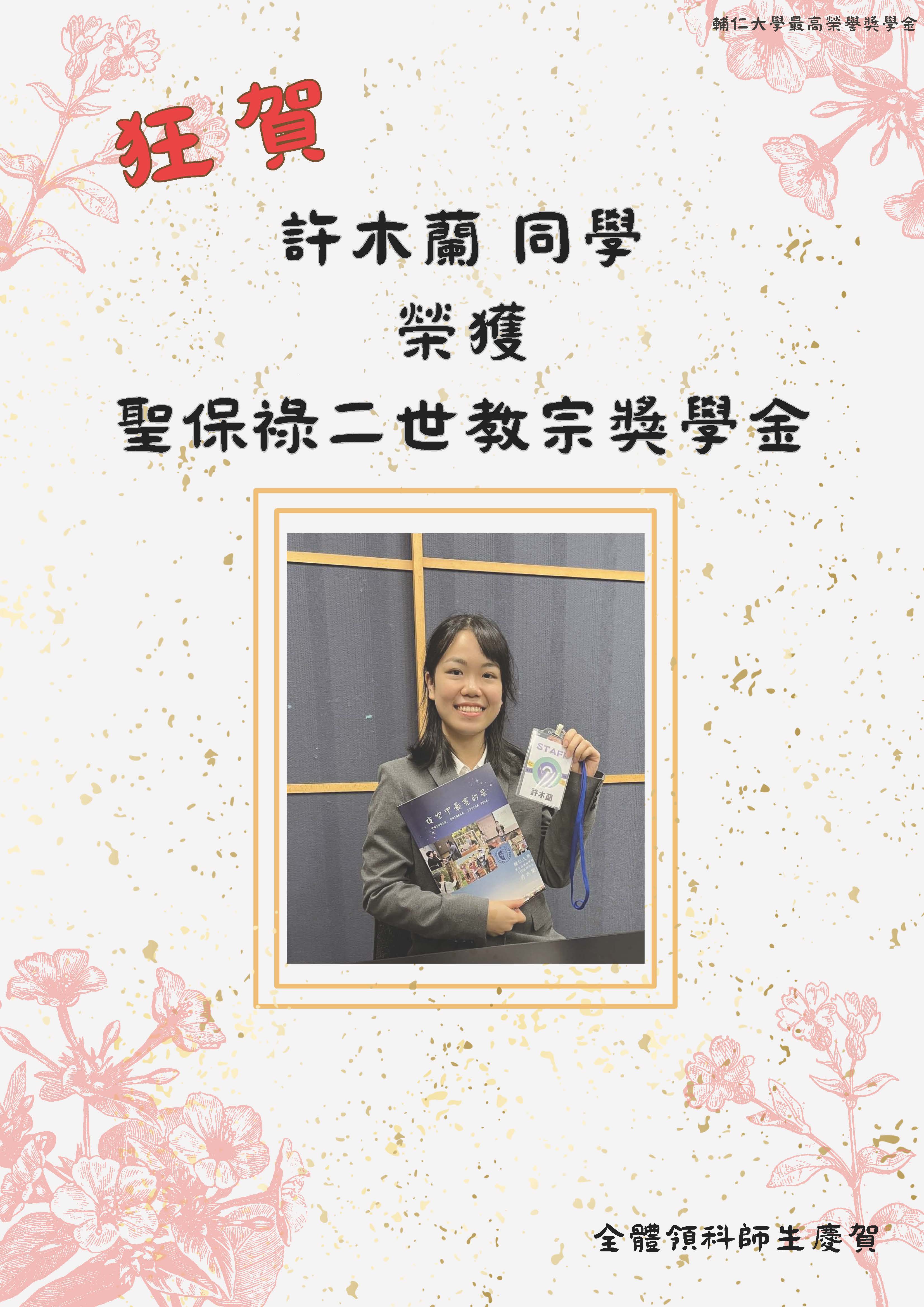 » ✨【賀】許木蘭同學榮獲「聖若望保祿二世教宗獎學金」!