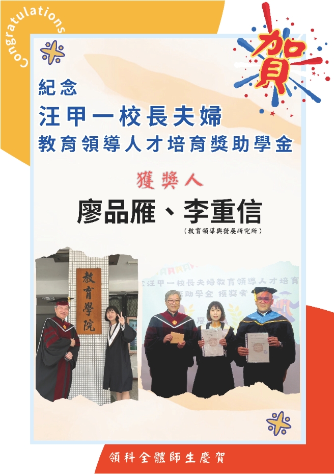 » ✨【賀】廖品雁同學榮獲「紀念汪甲一校長夫婦教育領導人才培育獎助學金」!
