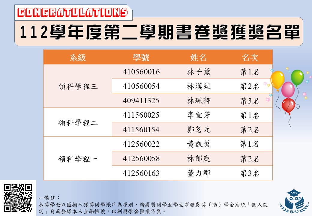 【112學年度第二學期書卷獎獲獎名單公告,恭喜獲獎同學!!